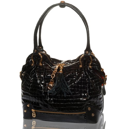 Pamper yourself with this gorgeous alligator embossed handbag from Marino Orlandi. Fantastic slouchy shape adds a modern touch. Made of soft croc-embossed patent leather in go with everything. Feature a gold-toned ball keyring and a matching black patent leather tassel that is perfectly polished and sporting a gorgeous Marino Orlandi signature logo. Astonishingly beautiful this is one of kind bag that is very large and roomy and will fit all daily essentials. Equestrian gold-plated "M" shaped hardware adds a luxurious touch and includes - o-ring details, and zipper pull. Indulge yourself when you wear this unique and beautiful masterpiece. Easy to carry with long dual straps that fit comfortably over the shoulder. This bag with roomy multi-purpose compartment becomes your trusted daytime companion. Measurements: 15 1/2" width, 11 1/2" height, 4 1/2" depth, strap drop 8". Top zippered closure and alternative padlock and key flap top closure. Multi-purpose single compartment, wall zippered pocket, cell phone and slip pockets. Jeweled signature fabric lined, designer leather logo patch. Included: signature gold-plated keychain, signature leather tassel, signature dust bag, and signature cardboard box..../ Marino Orlandi Italian Designer Croc Leather Slouchy Handbag / Special Occasion